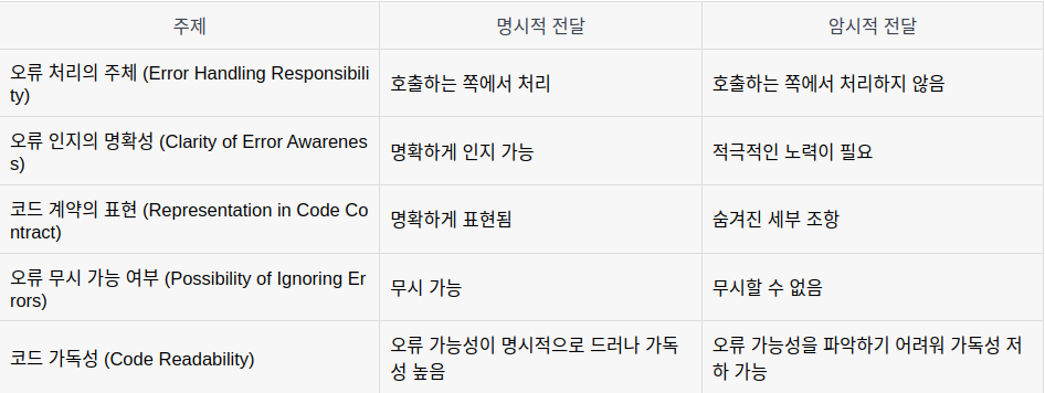 코드를 직접 호출한 쪽에서 오류가 발생할 수 있음을 인지할 수 밖에 없도록 하는 것입니다. 그것을 처리하든, 이전 호출자에게 전달하든 , 무시하든 간에 호출하는 쪽에서 오류 처리가 달려있습니다. 또한 무엇을 선택하든 그것은 적근적인 선택의 결과입니다. 오류가 발생할 가능성이 코드 계약에 명확하게 나타나 잇기 때문에 오류를 모르고 넘어갈 가능성은 없습니다