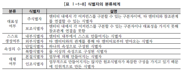 식별자란 하나의 엔터티에 구성되어 있는 여러 개의 속성 중에 엔터티를 대표할 수 있는 속성을 의미하며 하나의 엔터티는 반드시 하나의 유일한 식별자가 존재해야 한다