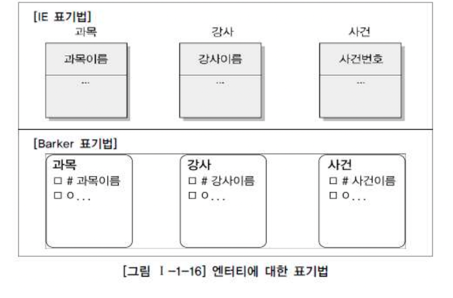 - 개념엔터티: 물리적인 형태가 없고, 개념적 정보로 구분되는 엔터티(ex. 조직, 보험상품)