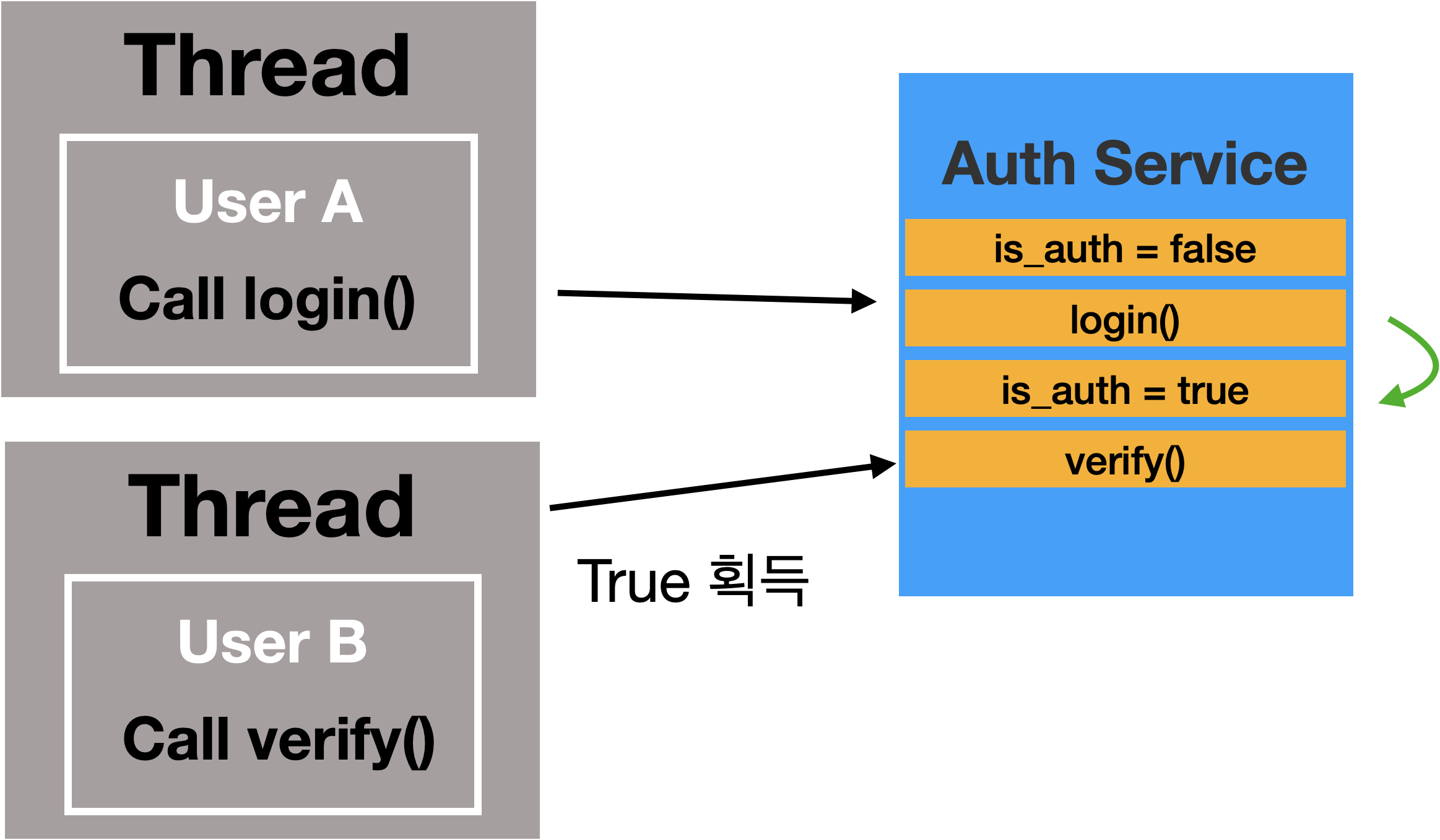 그림을 설명하자면 thread1에서는 login을 성공하여 thread local에 is_auth를 true로 저장할 수 있었다.