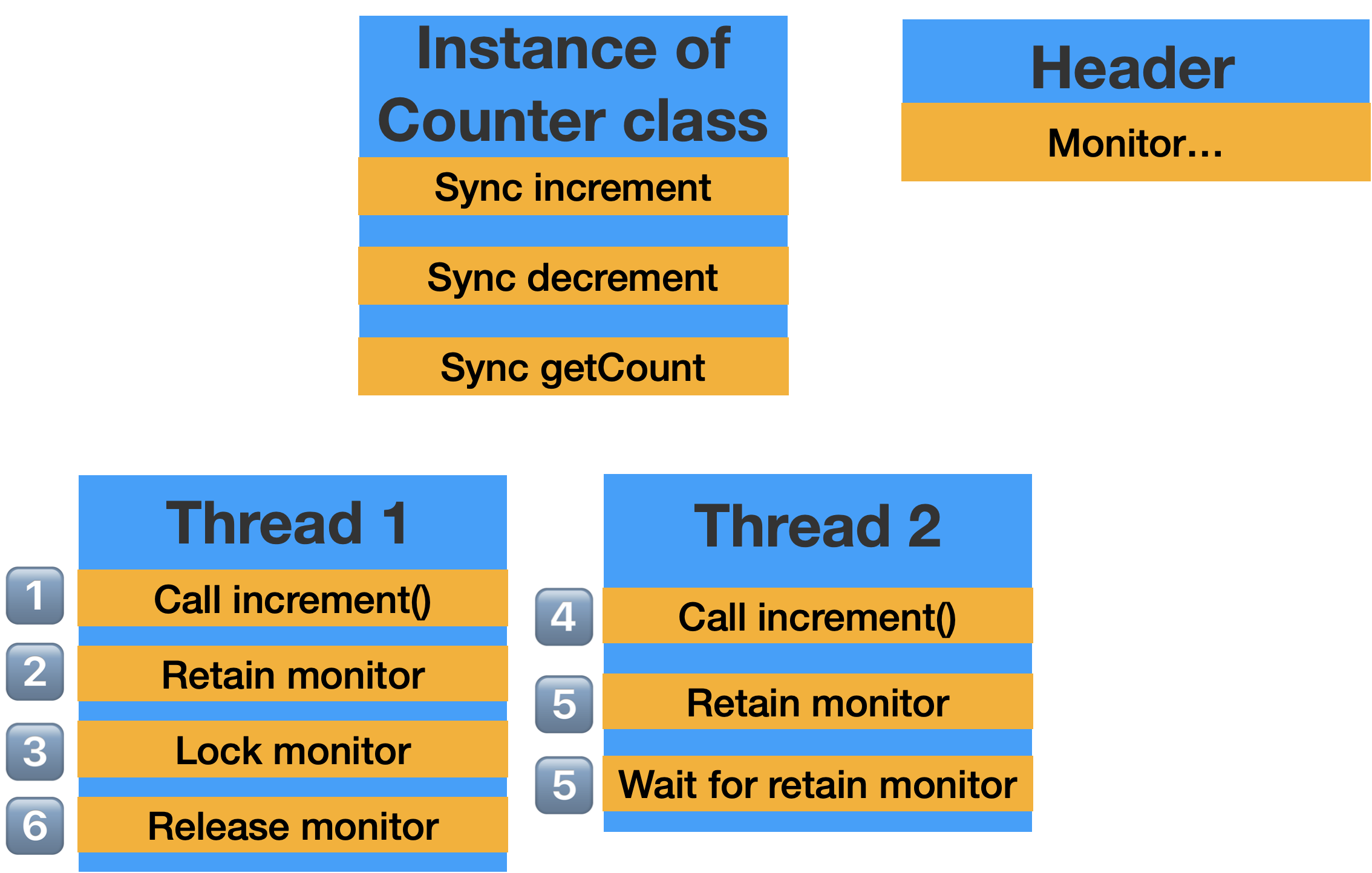 그럼 아래의 그림처럼 하나의 Counter 객체에 여러 개의 Thread가 Sync increment함수를 호출하게 되면 다음과 같은 순서로 실행됩니다.
