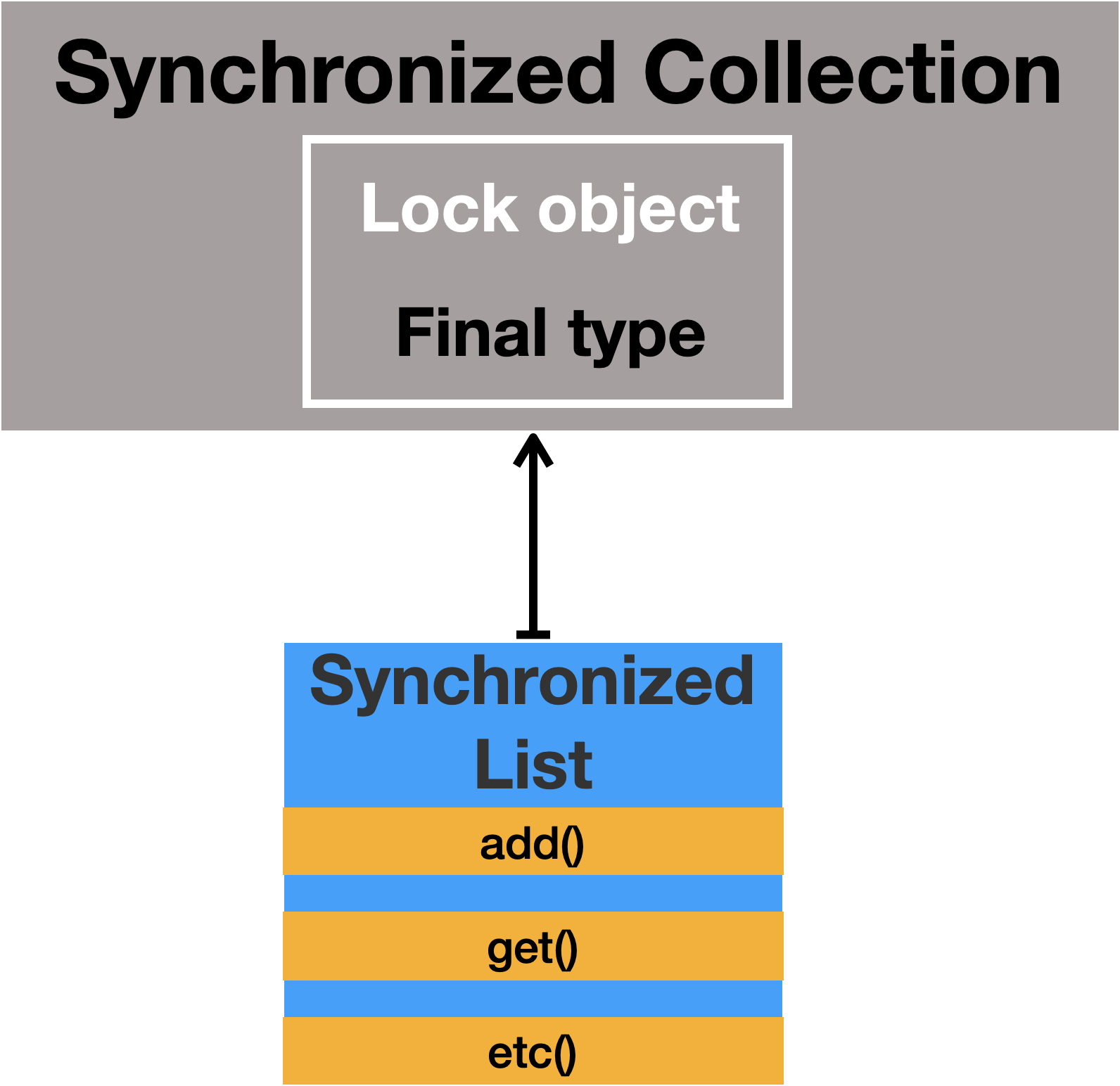 Synchronized list 클래스를 보면 다음과 같이 synchronized구문에 부모 객체의 lock을 넘겨주면서 쓰레드 간의 동기화를 보장합니다.