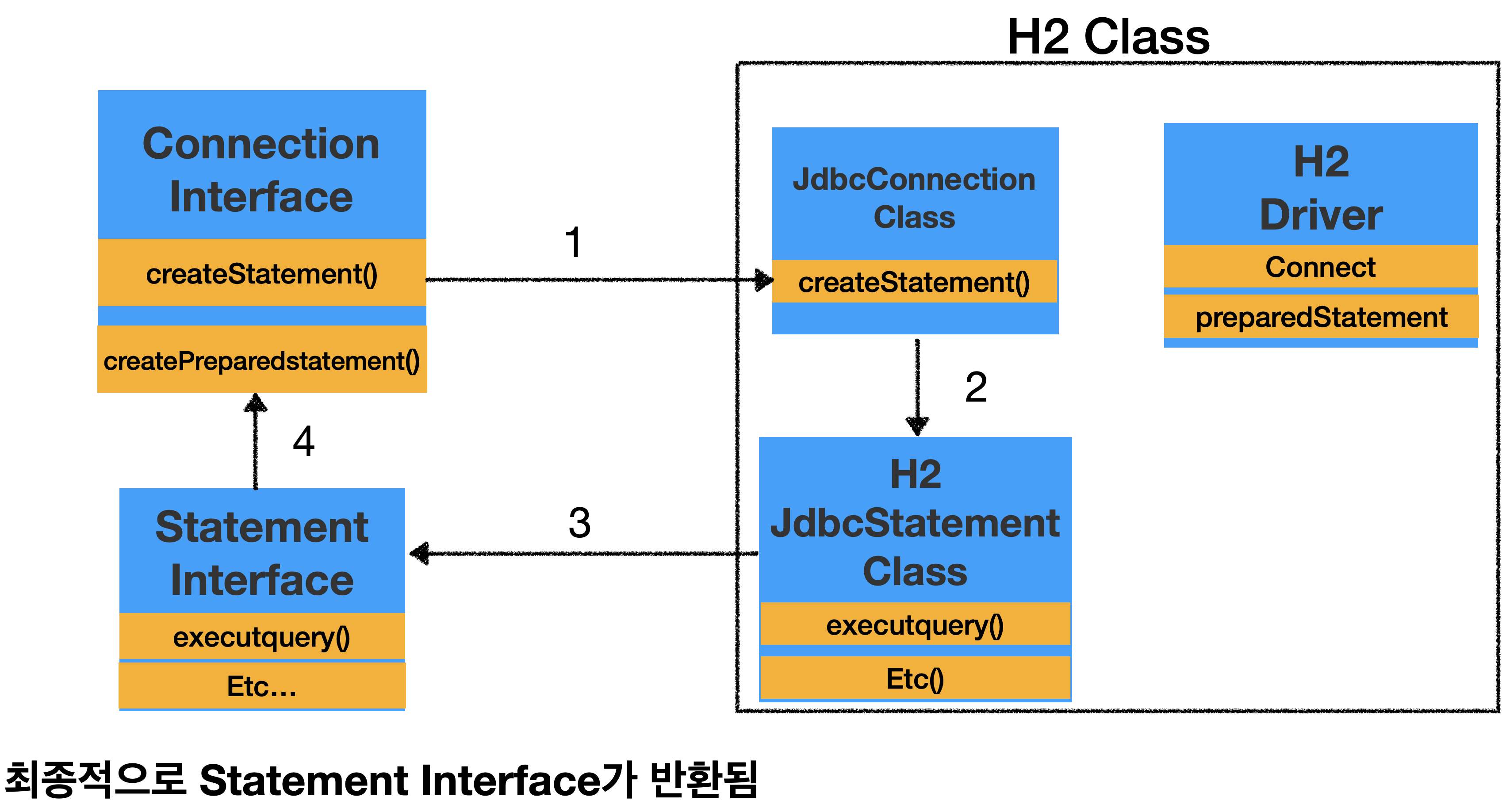- 벤더사에서 Statement 또는 PreparedStatement 인터페이스를 구현한 객체를 반환합니다.