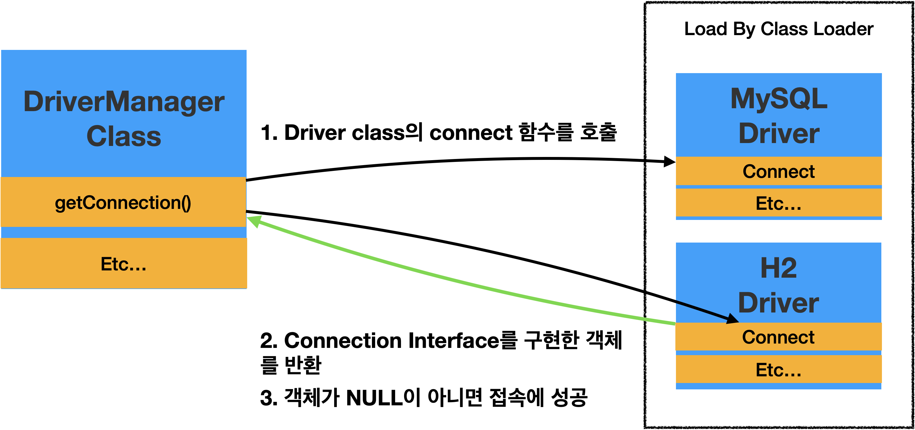 Driver를 관리하는 것이 DriverManager입니다. 클래스 로더가 각 벤더사가 구현한 Driver 클래스를 로드하게 되고, DriverManager가 각 벤더사의 connect 함수를 통해 데이터베이스에 접속을 시도합니다. 연결이 성공하면 Connection 객체를 반환하게 됩니다.