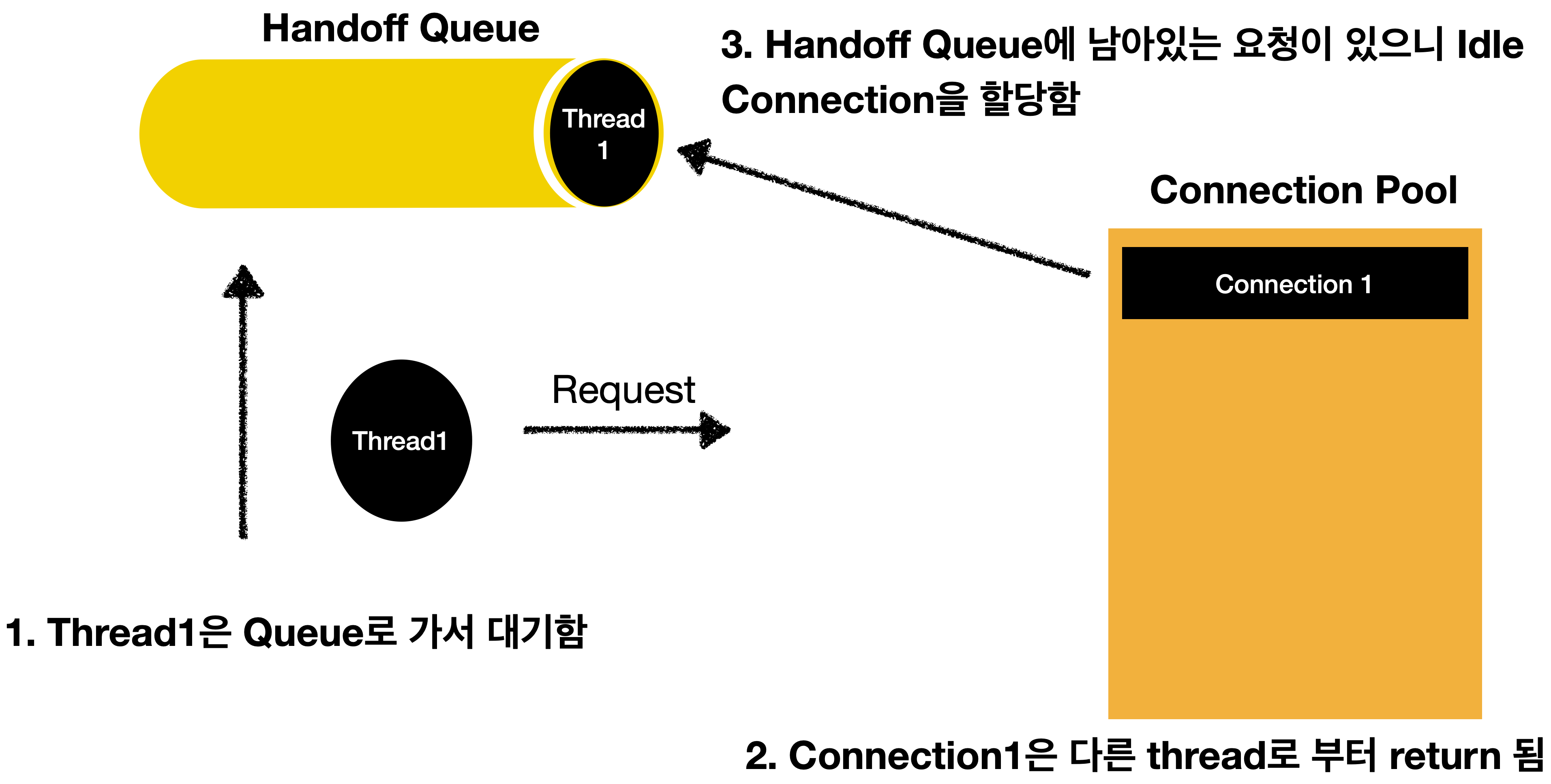 - 만약 Connection 객체가 없다면 요청 THREAD는 handoff queue에 들어가서 대기하게 됩니다