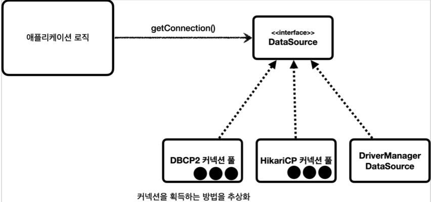 DB Connection Pool은 각 벤더사마다 구현한 방법이 모두 다르다. 따라서 자바에서는 Datasource라는 인터페이스를 사용해서 Connection Pool기능을 제공해준다. Hikari CP는 최종적으로 JDBC인터페이스를 사용하기 때문에 각 벤더사의 의존성을 없앨 수 있었다.