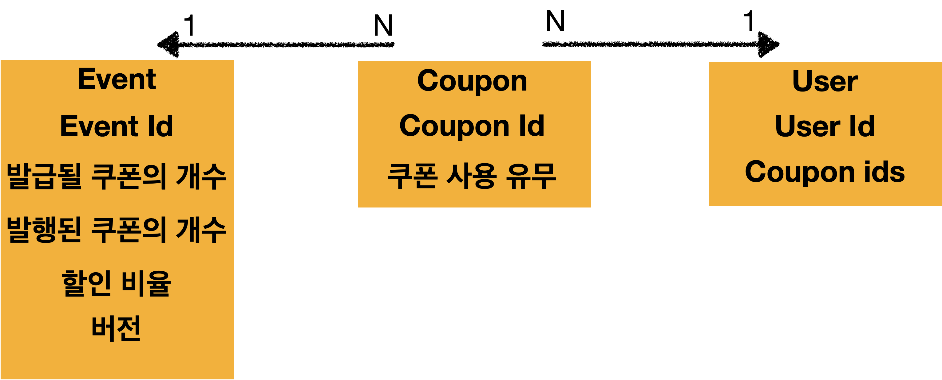 최초 설계는 다음과 같이 생성했다. 하지만 문제가 생겼는데 그 이유는 쿠폰의 사용 요청이 들어왔을 때 쿠폰이 실제로 User에게 있는지, 쿠폰이 사용됐는지를 검색하기 위해선 User엔터티에 속해있는 Copon 엔터티를 모두 조회해야 한다는 단점이 생겼다.