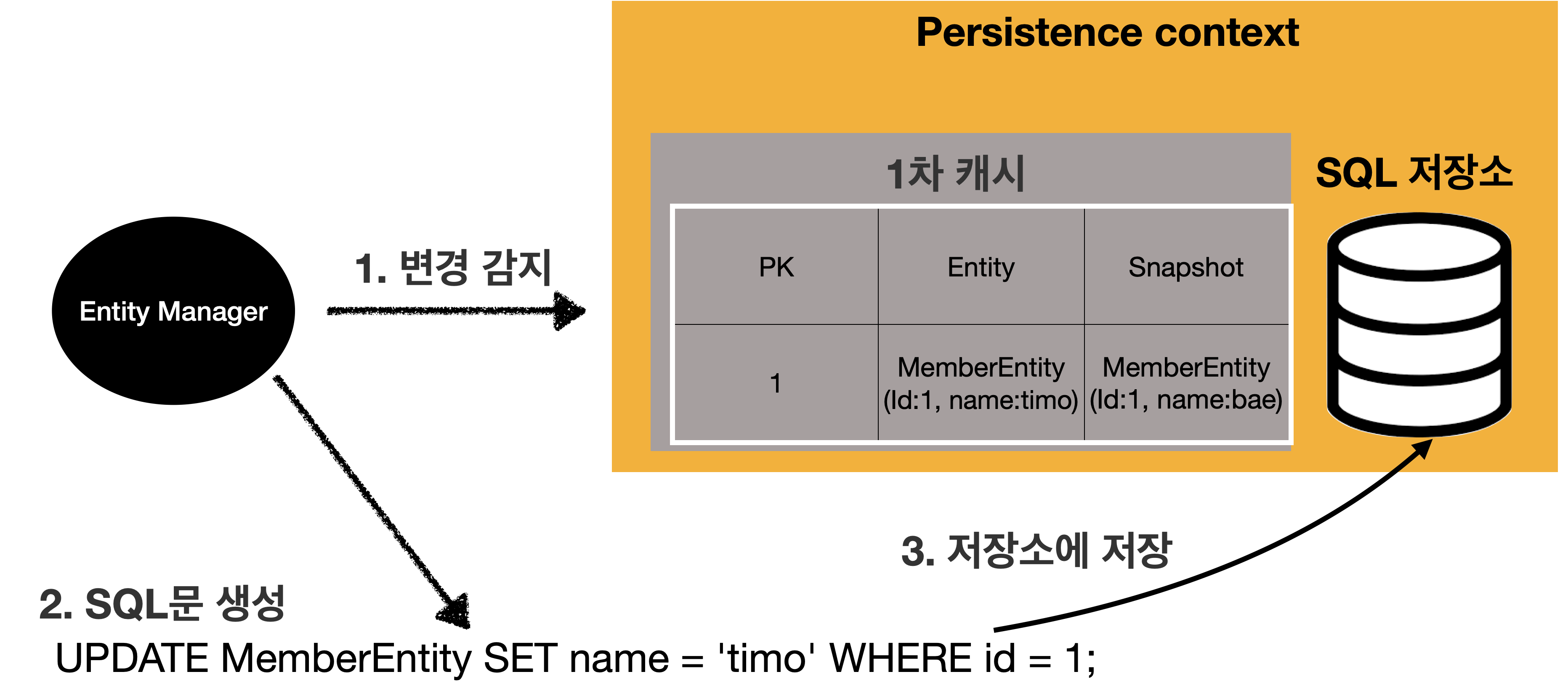 - 엔티티가 처음 영속성 컨텍스트에 저장될 때, JPA는 해당 엔티티의 스냅샷을 생성합니다. 이 스냅샷은 엔티티의 원래 상태를 기록한 것입니다.