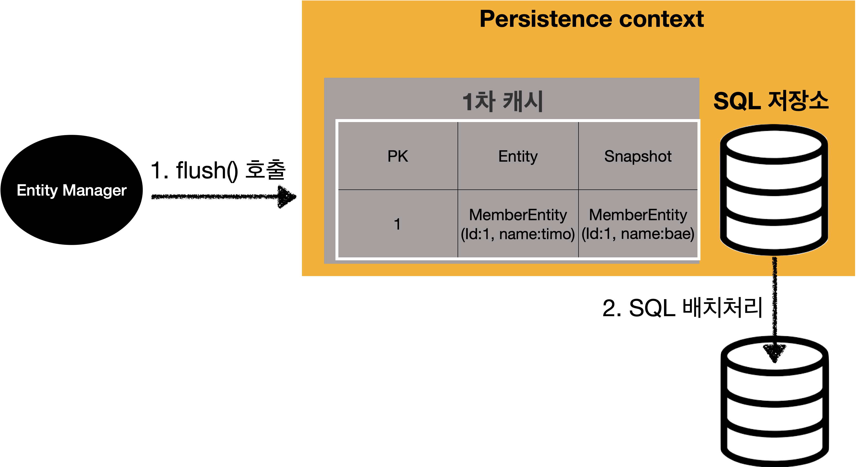 - Flush가 호출되면 영속성 컨텍스트에 있는 모든 변경 사항이 데이터베이스에 동기화됩니다.