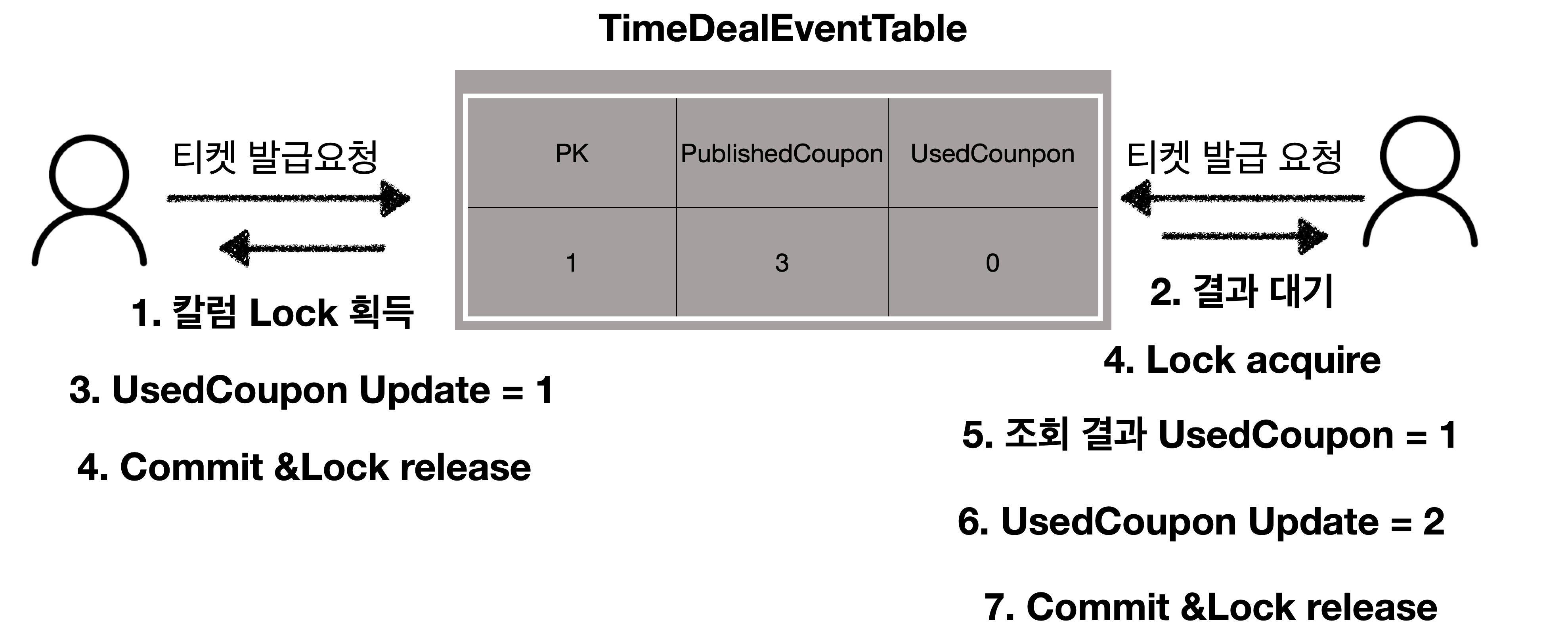 만약 아래의 그림과 같이 사용자 두 명이 동시에 티켓 발급 요청이 들어오면 어떻게 될까? TimeDealEvent의 칼럼은 동시성 제약이 없기 때문이 사용자 둘 다 발급된 쿠폰이 없다고 나올 것이다.