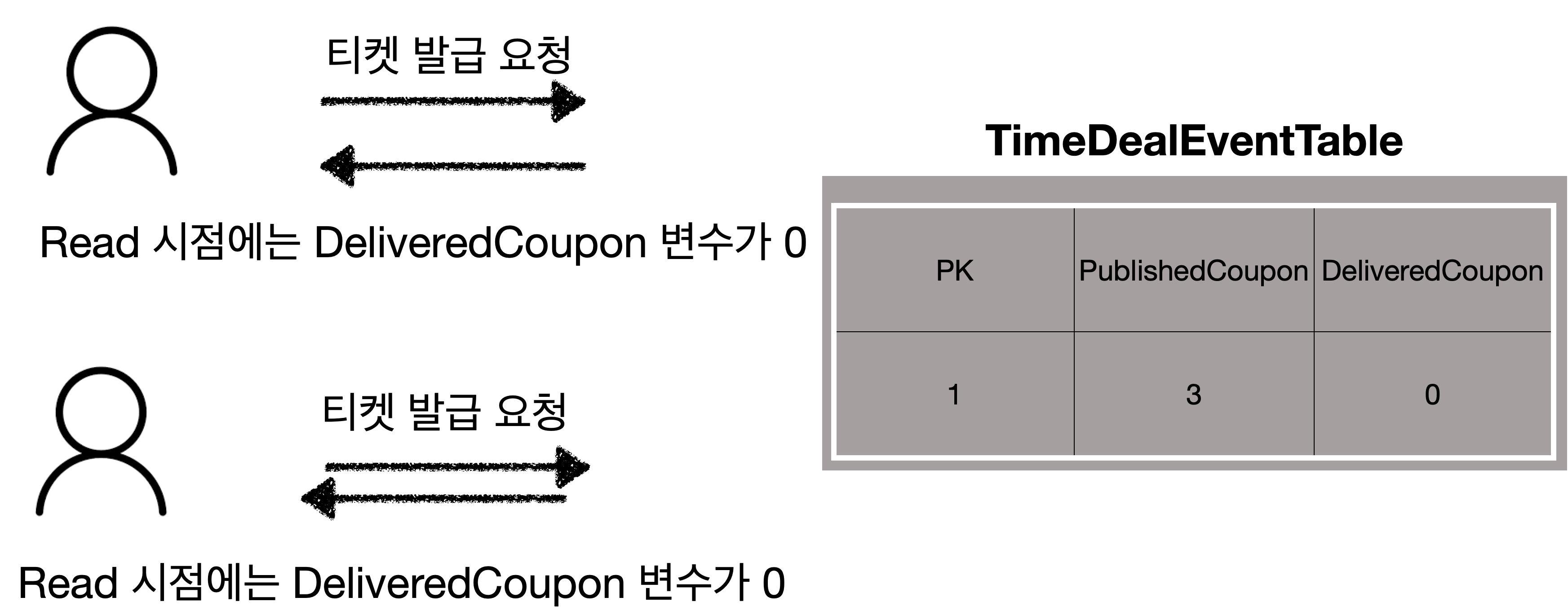 만약 아래의 그림과 같이 사용자 두 명이 동시에 티켓 발급 요청이 들어오면 어떻게 될까? TimeDealEvent의 칼럼은 동시성 제약이 없기 때문이 사용자 둘 다 발급된 쿠폰이 없다고 나올 것이다.