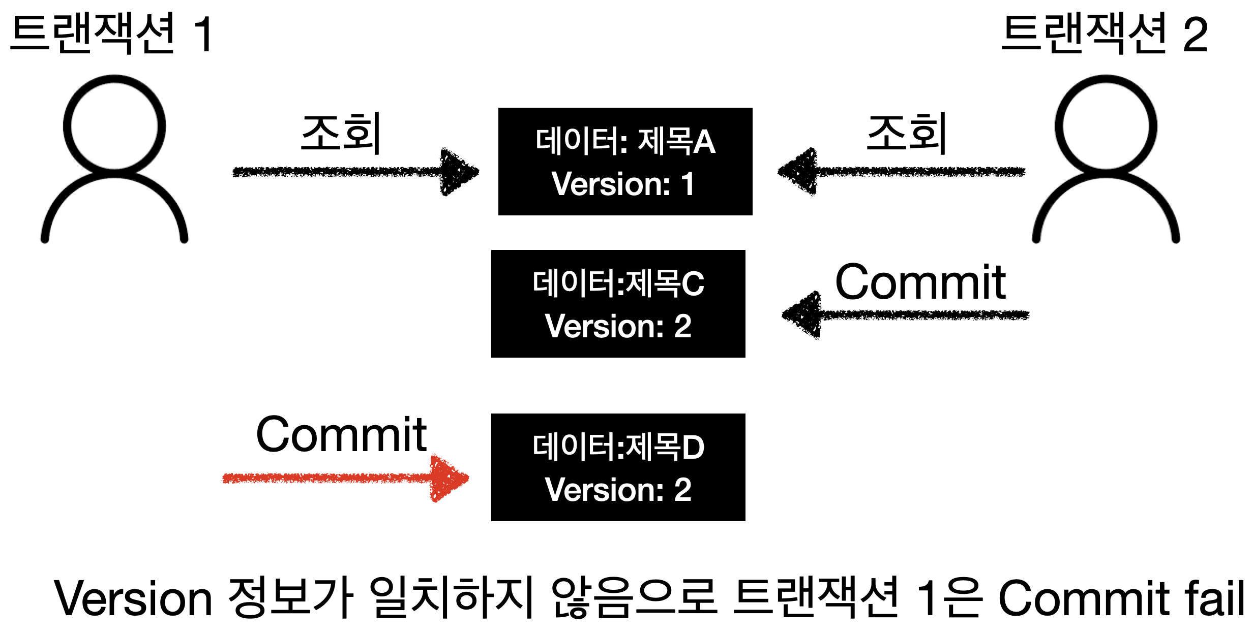 - 버전 정보가 일치하지 않으면 충돌로 간주하여 트랜잭션을 롤백합니다.