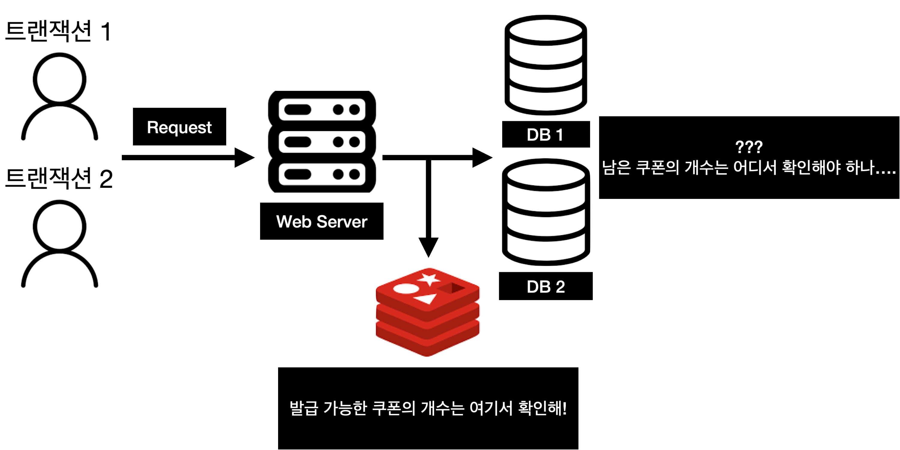 데이터베이스(DB)의 부하가 심해져서 스케일 아웃(Scale-Out)을 한다고 가정해보자. 그렇게 된다면 기존의 인프라 방식에서는 데이터(발급 가능한 쿠폰의 개수)를 어디에 저장해야 할지 규칙을 정해야만 한다. 하지만 미들웨어로 레디스 서버를 도입하게 되면 레디스에 쿠폰의 개수를 저장하는 캐시 서버를 둠으로써 데이터의 정합성을 보장할 수 있을 것이다.
