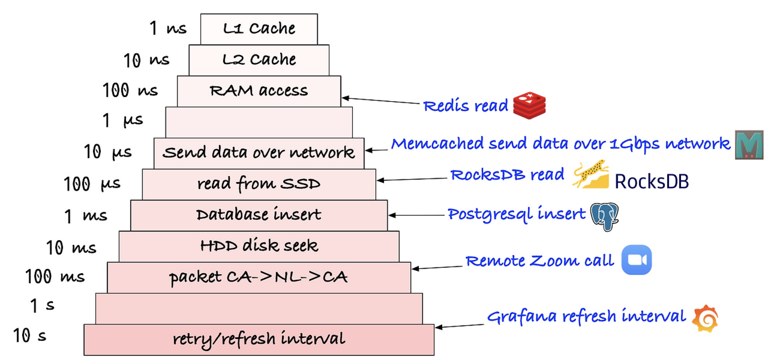 아래 그림을 보면 속도적 측면이 있다. Redis에 접근해서 데이터를 읽을 때는 100ns + 네트워크 지연만 있으면 되지만, 데이터베이스의 경우에는 1ms + 네트워크 지연만 있으면 된다.