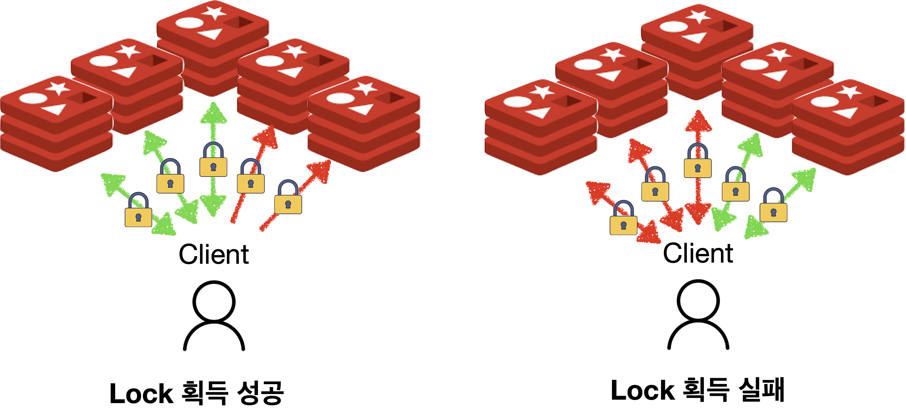 그림과 같이 노드들에게 Lock 획득 요청을 보냈을 때 과반수 이상의 노드들에게서 Lock을 획득했다면 해당 자원에 Lock을 성공한 것입니다.