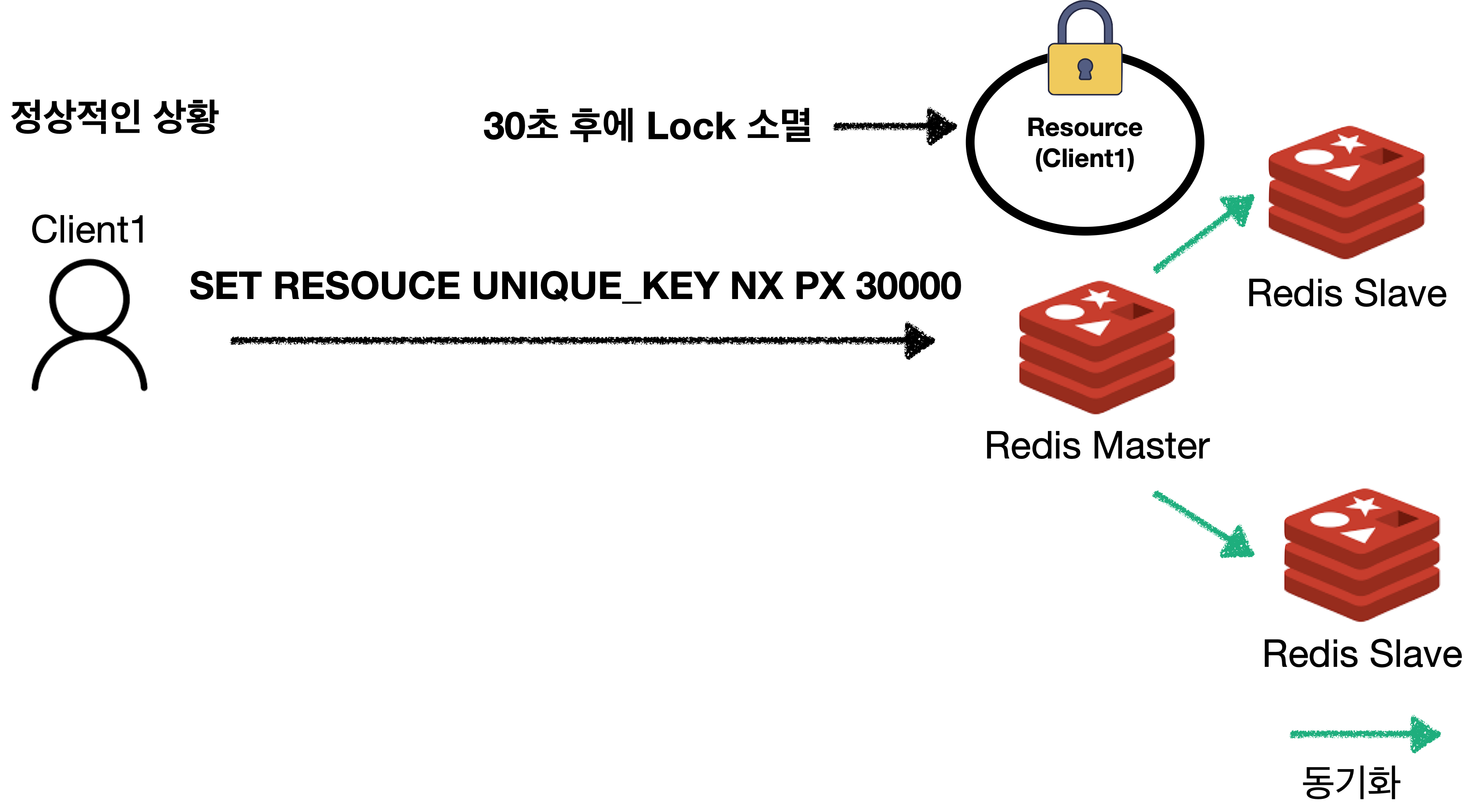 아래와 같은 상황이 있다고 가정했을 때 Client1이 획득한 락이 slave에 동기화 되면서 master가 다운되도 최소한의 조건은 모두 만족될 것입니다.