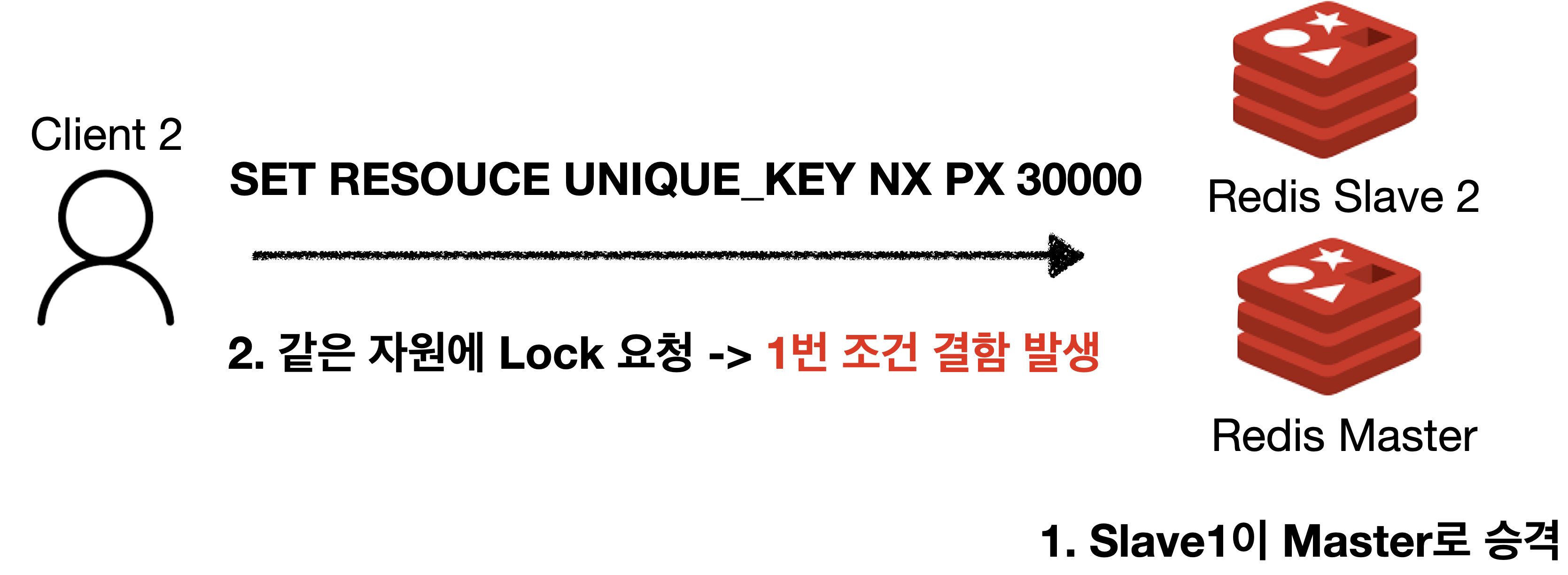 하지만 아래의 그림과 같이 Master가 동기화 전에 죽어버린다면 상호배제 조건을 지키지 못하게 됩니다. 아래의 그림과 같이 Client 1은 Master에서 Lock을 획득했지만, 해당 내용이 동기화되지 않고, master가 죽어벼렸고, Slave 중 하나가 Master로 승격됩니다.