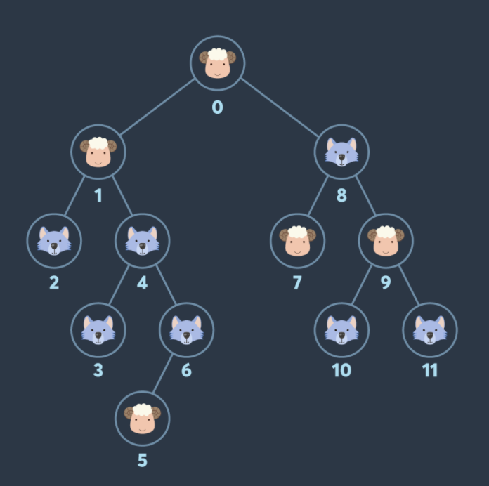 2진 트리 모양 초원의 각 노드에 늑대와 양이 한 마리씩 놓여 있습니다. 이 초원의 루트 노드에서 출발하여 각 노드를 돌아다니며 양을 모으려 합니다. 각 노드를 방문할 때 마다 해당 노드에 있던 양과 늑대가 당신을 따라오게 됩니다. 이때, 늑대는 양을 잡아먹을 기회를 노리고 있으며, 당신이 모은 양의 수보다 늑대의 수가 같거나 더 많아지면 바로 모든 양을 잡아먹어 버립니다.