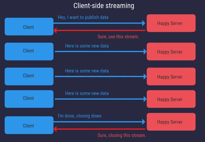 HTTP 1.1을 사용한 REST 통신에서는 기본적으로 각 요청마다 네트워크 연결을 수립해야 합니다. 반면, HTTP/2를 사용하는 gRPC는 이와 다르게 동작합니다. HTTP/2는 한 번의 TCP 연결만으로 클라이언트와 서버 간에 데이터를 계속 주고받을 수 있습니다. 클라이언트는 데이터를 지속적으로 서버에 전송할 수 있고, 서버도 마찬가지로 클라이언트에게 계속해서 데이터를 전송할 수 있습니다.