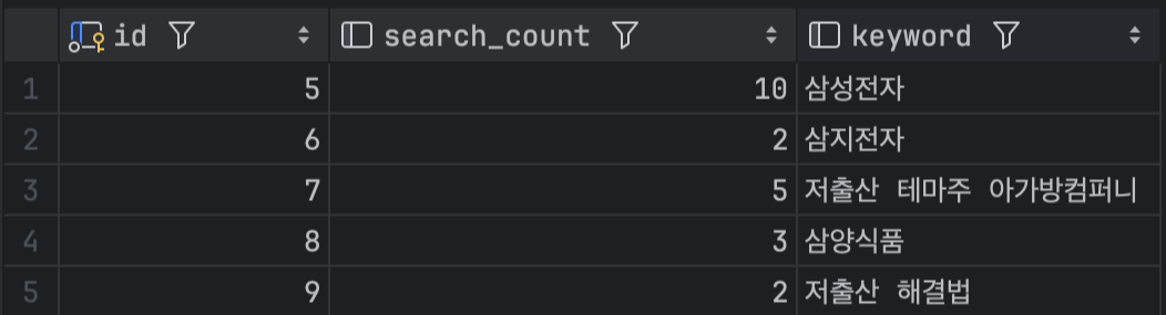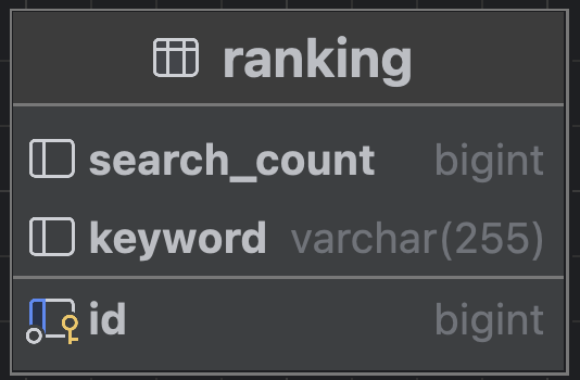 데이터베이스는 단일 테이블로 설계했습니다. 이는 추천 키워드 기능에 필요한 데이터가 '키워드'와 해당 키워드가 검색된 횟수에 대한 정보만으로 충분했기 때문입니다.