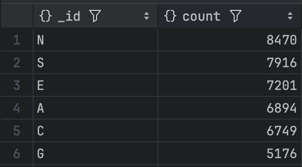 몽고 디비에서는 다음과 같은 명령어를 통해서 키워드들의 빈도수를 추출할 수 있습니다. 저는 트라이 구조를 지키기 위해서 keyword의 첫 문자만 추출하는 형식으로 진행했습니다.