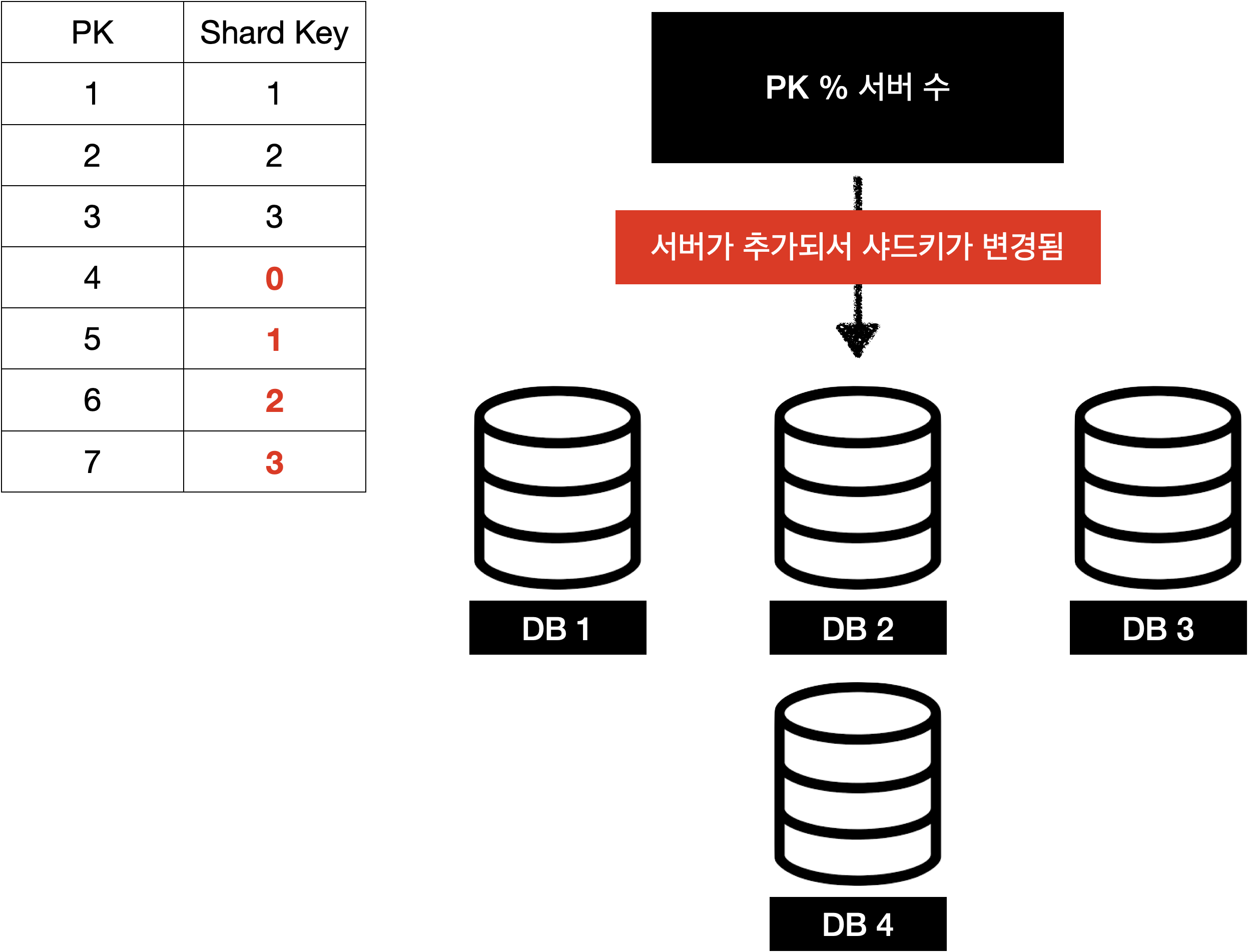 하지만 치명적인 약점이 존제하는데 서버가 추가되거나, 삭제되면 모든 샤드키가 변경되게 됩니다. 이는 데이터의 조회 시 다른 샤드를 참조할 수 있기 때문에 서버가 추가되거나 삭제되면 샤드에 맞게 데이터를 재정렬하는 상황이 생기게 됩니다.