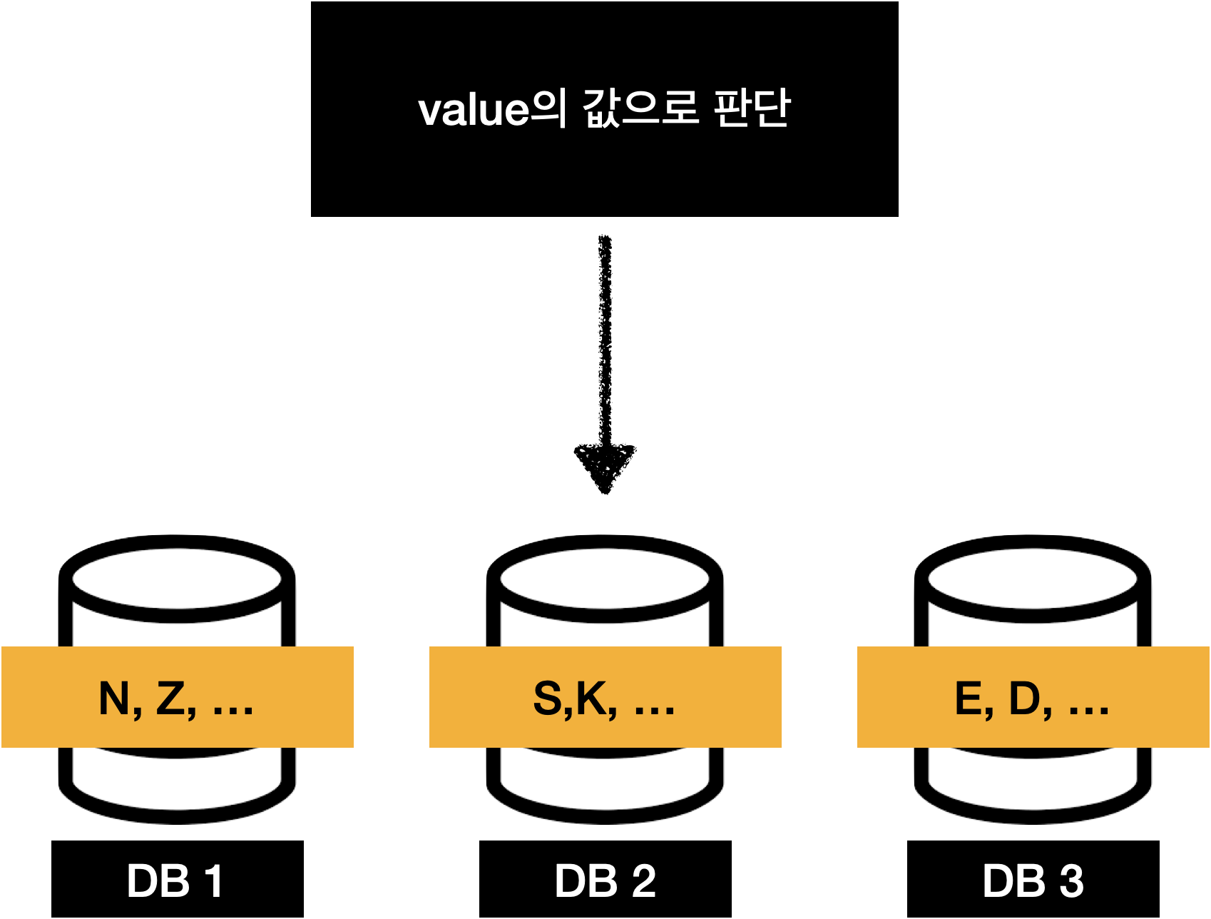 레인지 샤딩의 방식은 데이터를 키를 기준으로 저장소를 나누는 것입니다. 이 방식의 장점은 저장소가 추가되도 데이터의 재정렬이 발생하지 않습니다. 하지만 최악의 경우 특정 데이터베이스로만 값이 몰리게 되면서 샤딩 효과를 얻지 못한다는 단점이 생기게 됩니다. 이를 바로 Hot Spot 현상이라고 부릅니다.