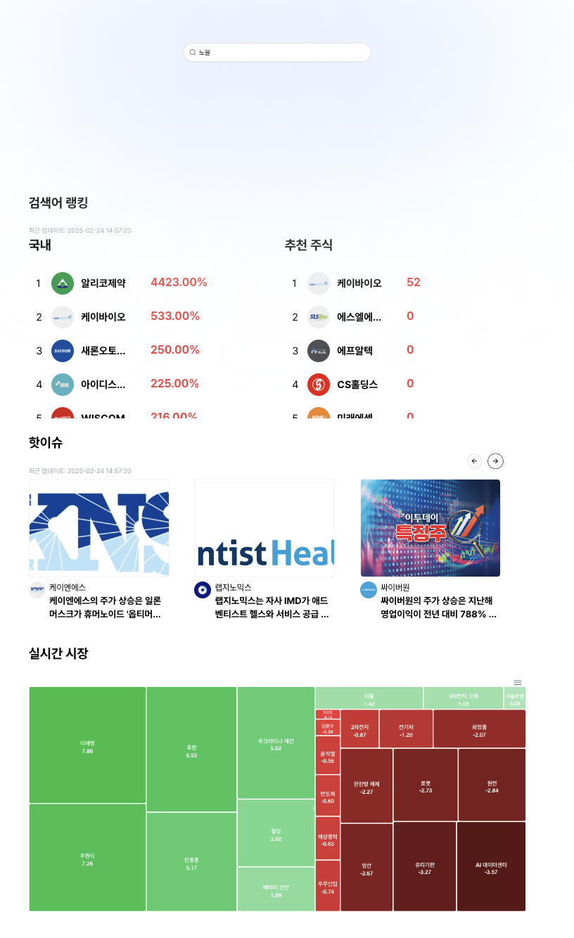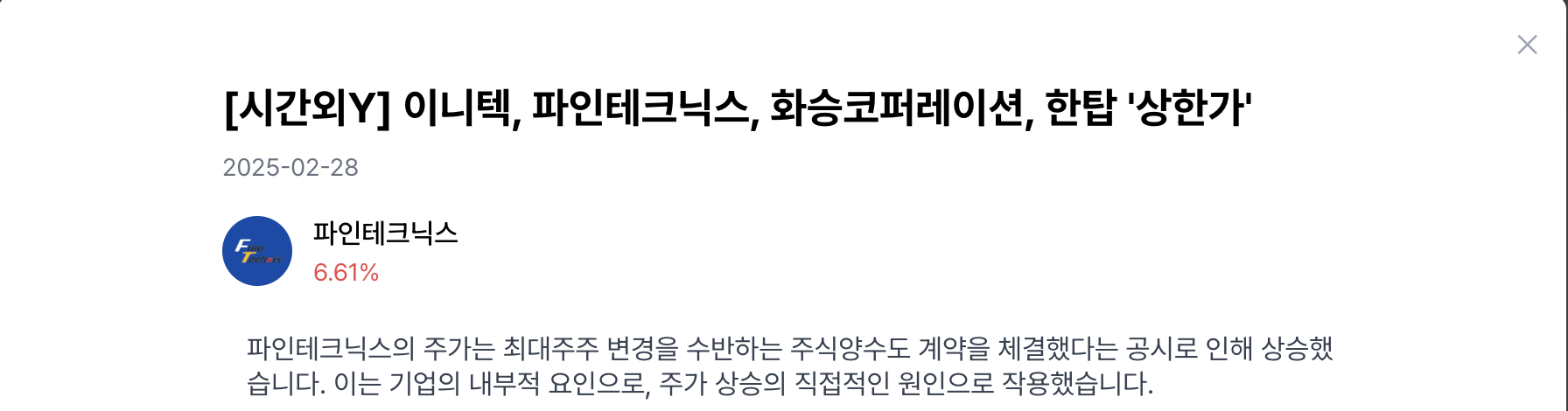 상단에 각 종목이 상승한 이유를 간략히 요약하고, 종목의 상승률을 함께 표시하는 방식으로 변경했다. 이 아이디어는 토스의 방식을 참고했다. 그 후 뉴스 전문을 사이트 내에서 자체적으로 제공하는 형식으로 변경했다.