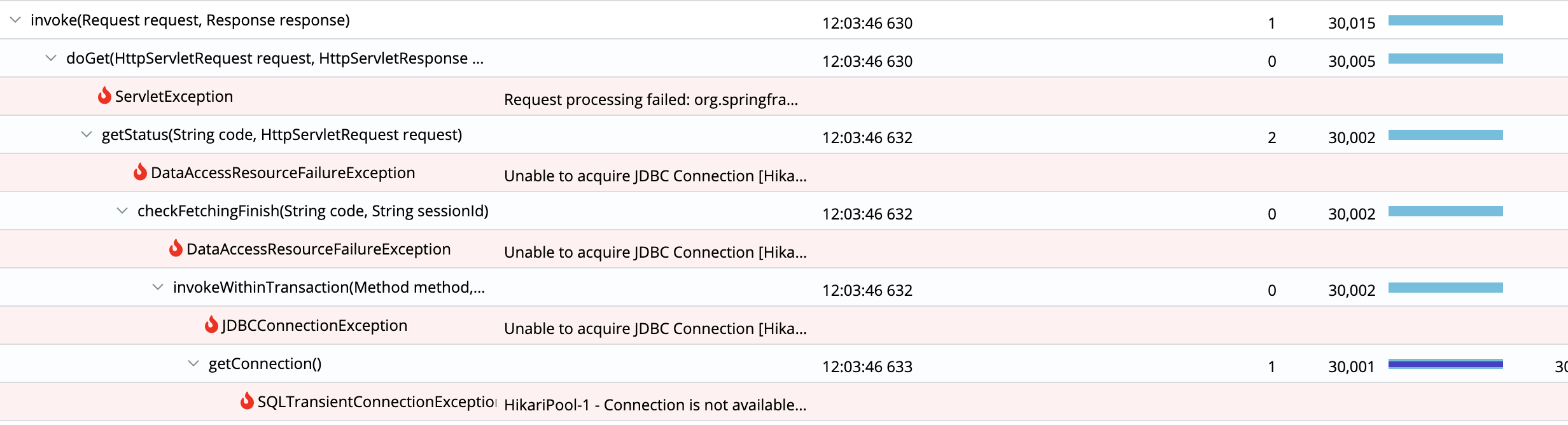 단순한 API임에도 불구하고, 실행 시간이 점차 증가하면서 DB 커넥션 문제(아래 이미지 참조)가 발생했습니다. 요약하면, 주식 정보 조회 시 DB 커넥션을 획득하는 과정에서 문제가 발생한 것으로 보입니다.