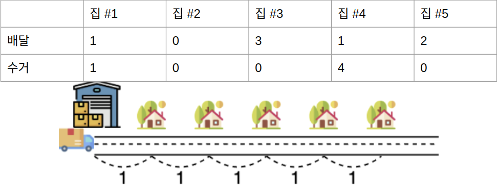 항상 택배차 용량만큼 적재해야 하는 이유는 수거해야 하는 집(집 #5)이 배달해야하는 집(집 #4)보다 더 멀리 있어도 배달을 하면서 해당 집에 도착할 때 항상 택배차 용량을 0으로 만들 수 있기 때문이다.