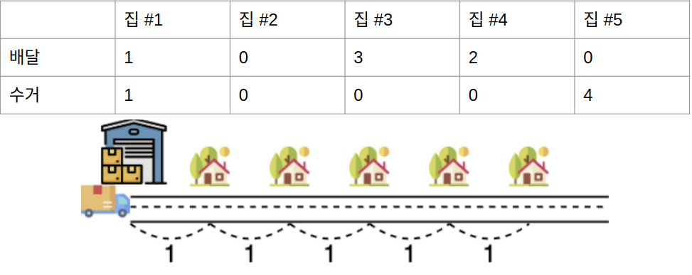 항상 택배차 용량만큼 적재해야 하는 이유는 수거해야 하는 집(집 #5)이 배달해야하는 집(집 #4)보다 더 멀리 있어도 배달을 하면서 해당 집에 도착할 때 항상 택배차 용량을 0으로 만들 수 있기 때문이다.